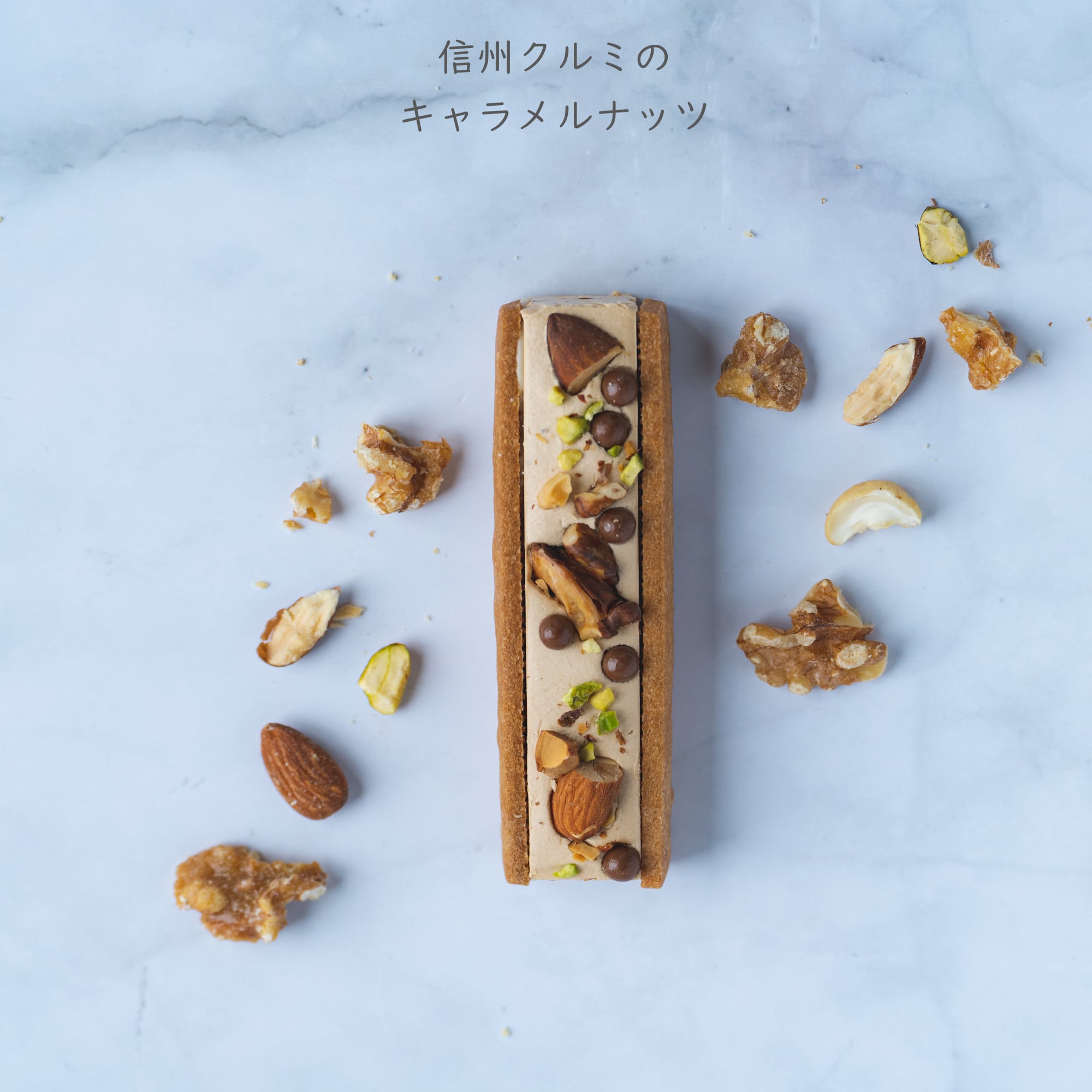 オメガ3脂肪酸を特に多く含む信州産「菓子クルミ」をはじめ、アーモンド・カシューナッツなどを丁寧にキャラメリゼ。ザクザクとした食感と共に楽しめる甘さとホロ苦さが絶妙なバランス