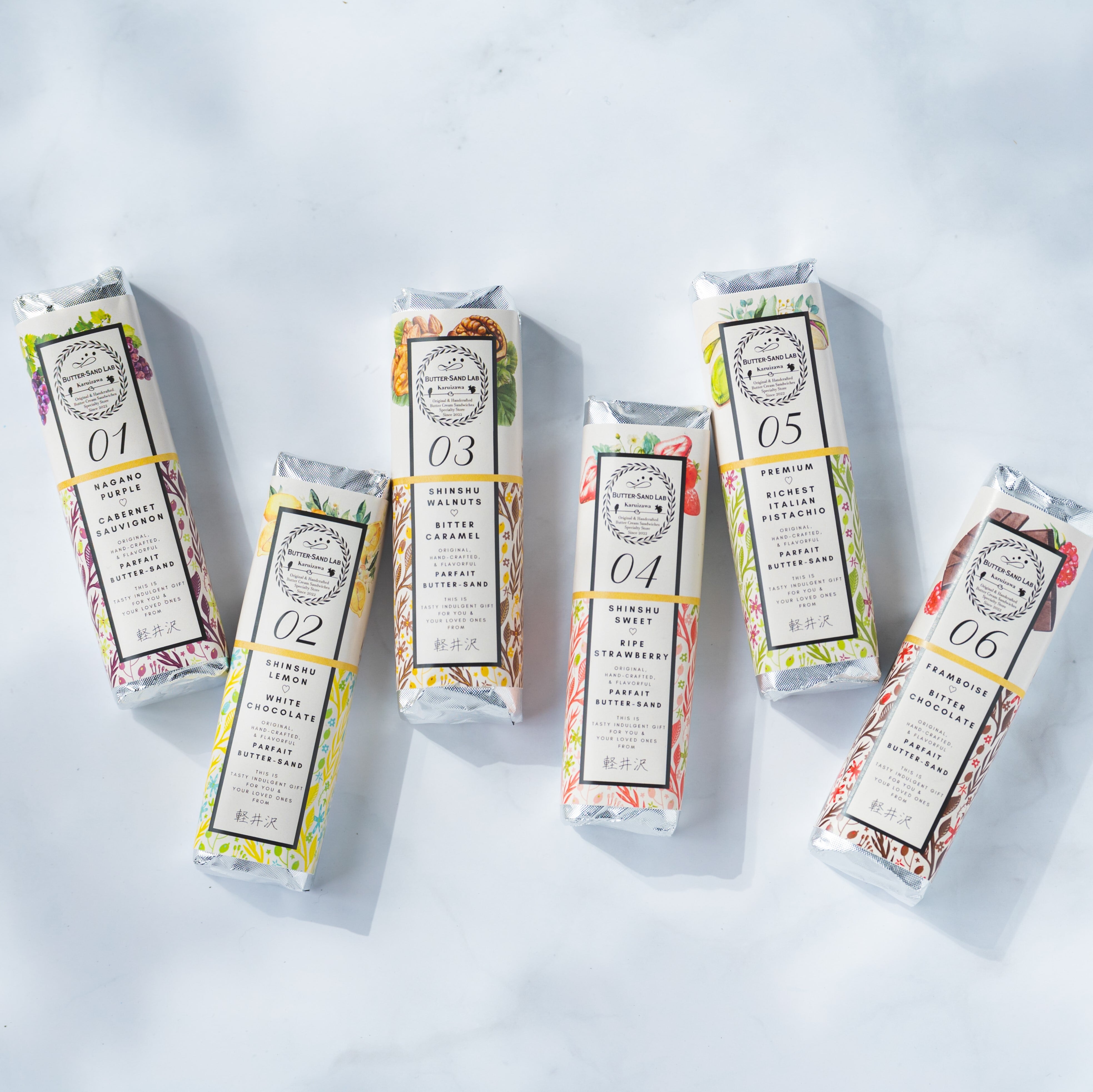 バターサンドラボ軽井沢の“パルフェバターサンド”は、信州産の様々なフルーツやナッツを口溶けの良いバタークリームと合わせ、信州産の小麦粉で焼いた香ばしいクッキーでサンドした新感覚スイーツです。当店でしか味わえない信州の食材を生かしたフレーバー達をお楽しみ下さい。